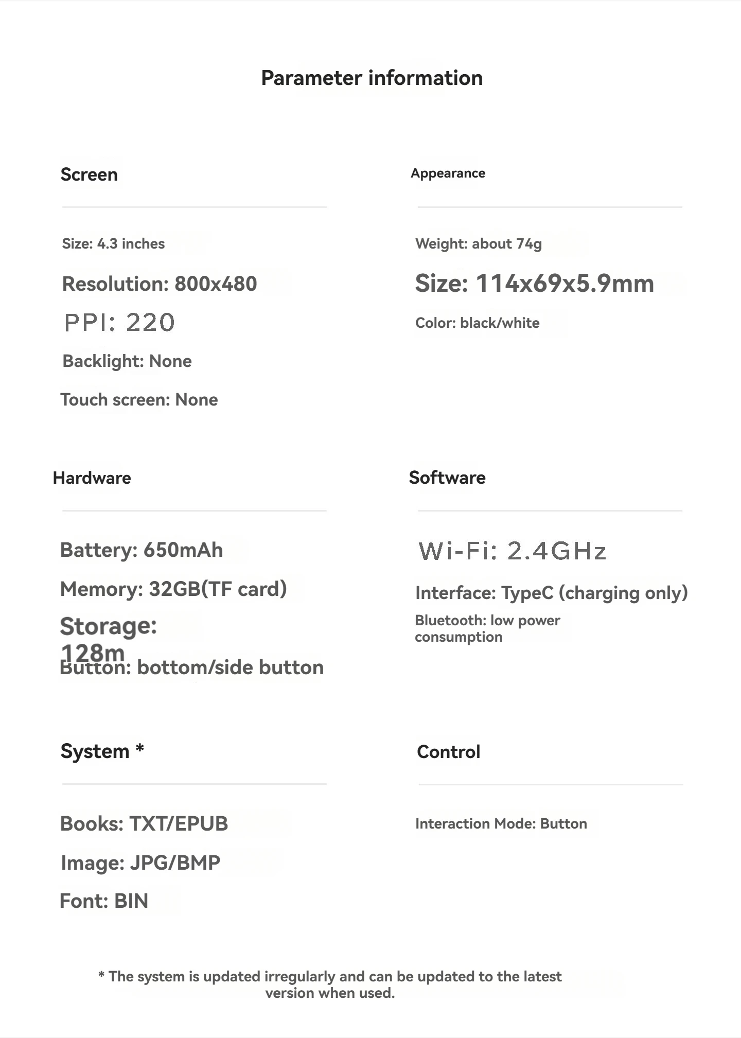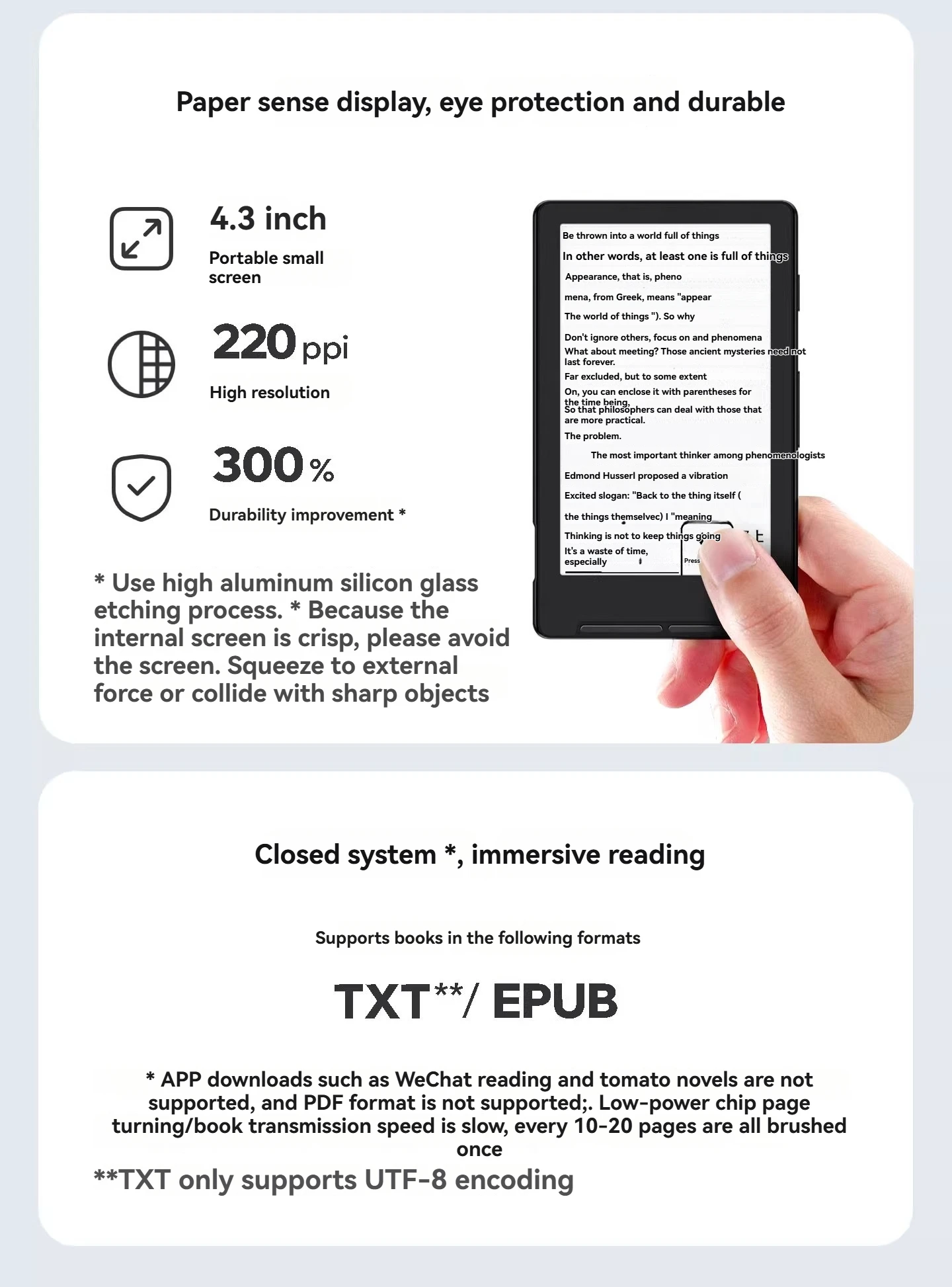 4. النظام والقراءة: نظام مغلق، يدعم القراءة الغامرة، ويدعم كتب تنسيق TXT (تشفير UTF-8 فقط) وEPUB.