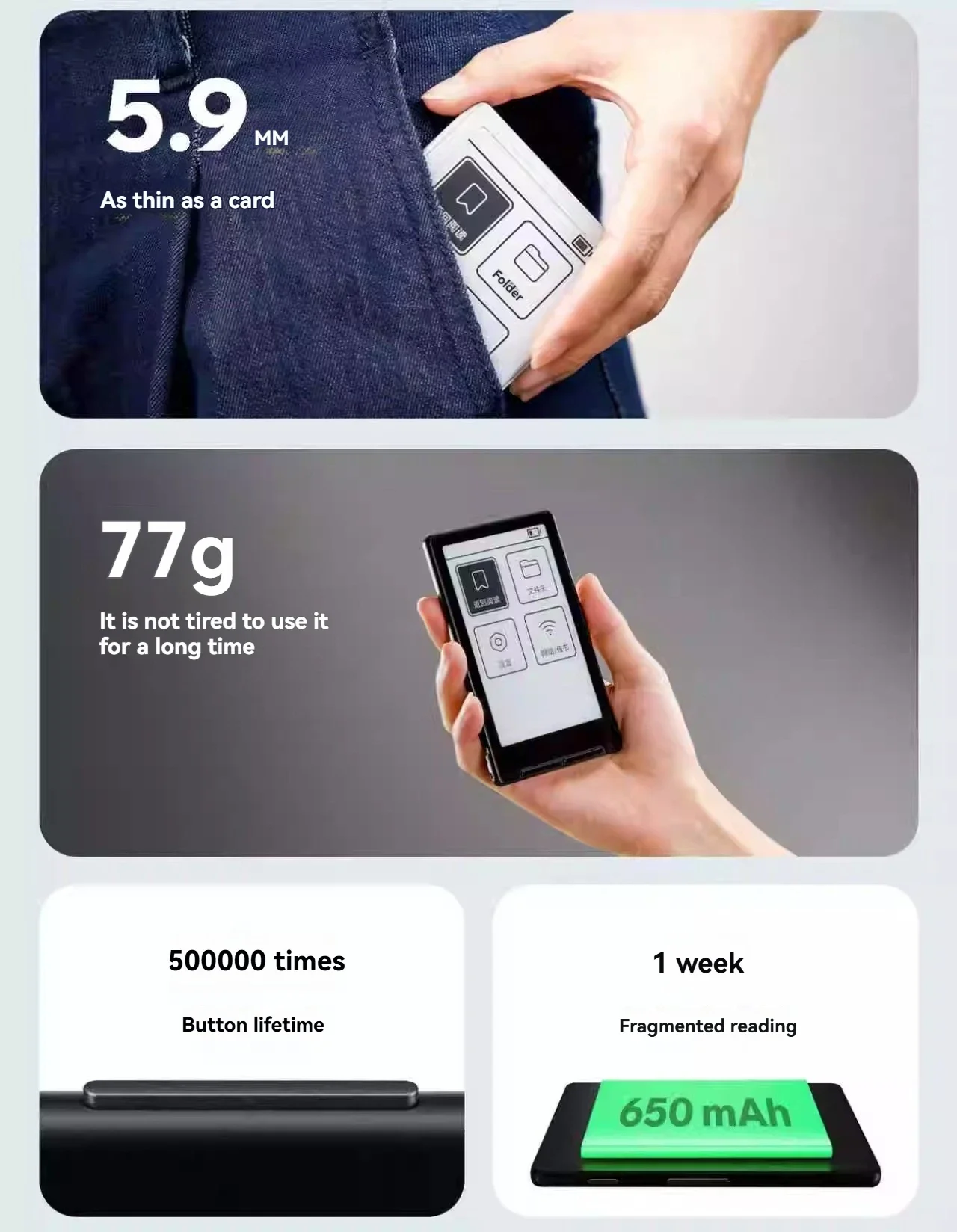 1.التصميم وقابلية النقل: ورق إلكتروني مغناطيسي، خفيف الوزن للغاية، 77 جرامًا فقط، غير متعب للاستخدام لفترة طويلة؛الرابعةالشاشة الصغيرة المحمولة مقاس 3 بوصات هي مؤسس الورق الإلكتروني المحمول للغاية، والذي يمكن قلبه وقراءته بعد توصيل الهاتف المحمول، ويمكن أيضًا تعليقه على حقيبة الظهر، وهو مناسب لسيناريوهات متعددة مثل التنقل والتخييم في الهواء الطلق والطيران على ارتفاعات عالية. .